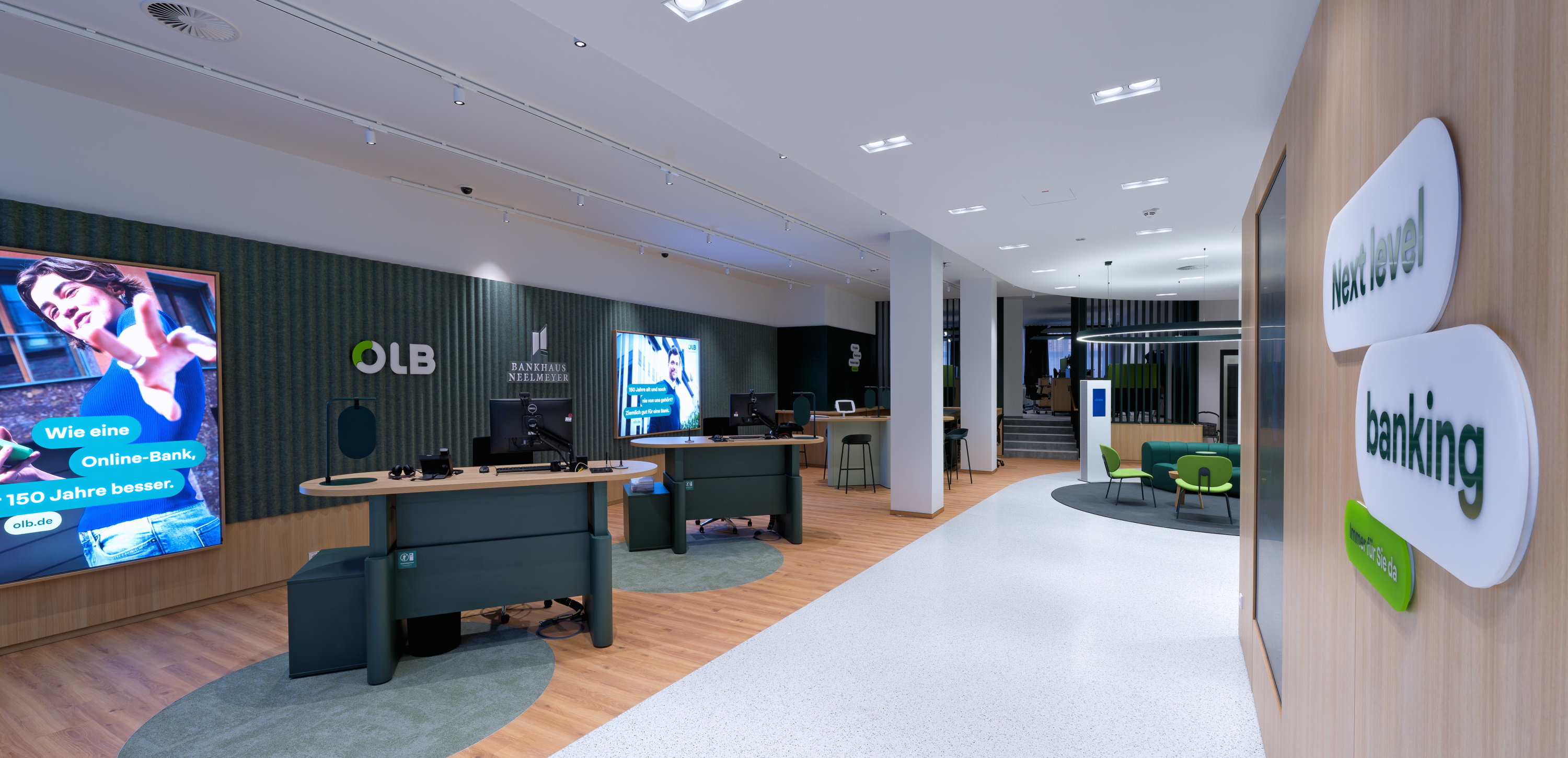 An den Standorten Nordenham, Bremen, Rastede und Vechta ist das Filialkonzept bereits erlebbar, weitere werden folgen: zeitgemäßes Design, moderne Gestaltung, das OLB-Grün als frische Farbe findet ebenso viel Verwendung wie Holz als nachhaltiges Material. Die einladenden Räumlichkeiten fördern die Kommunikation und die Zusammenarbeit, hier verbinden sich die persönliche Beratung und digitale Komponenten zu einer harmonischen Einheit. Individuelle stilisierte Motive aus der jeweiligen Stadt oder Region sind auf Glasflächen angebracht und verstärken auch optisch die Verbundenheit der Bank zum Standort.